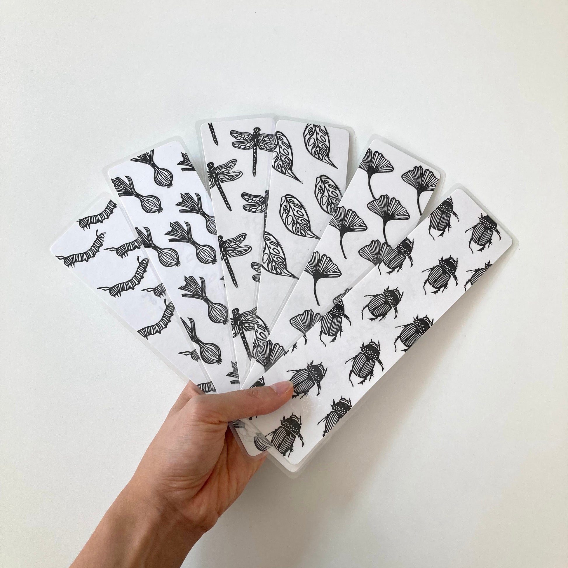Hand-printed, original bookmark covered in a protective plastic laminate. Each bookmark is unique, with no two exactly the same. Just under 2.5in wide, 8.75in long.